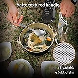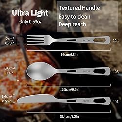 Ultra-lightweight: Titanium Knife Fork Spoon Set helps you eat all kinds of foods efficiently. A knife and fork can be used for eating steaks, and a spoon can be used for having soup. Reusable and Healthy: Say no to throwaway or plastic flatware, 50% lighter than stainless steel. knife is 18.4cm/ 7.2inch, the spoon is 16cm/6.3inch & fork is 16.5cm/6.5inch in length, Knife and spoon is 15g/0.5oz each and fork is 12g /0.45ozin weight Eco-friendly& Allergy-free: Made of 99.9% pure titanium, 100% food-grade. without lining and coating, Easy to clean, dishwasher safe Keep your Utensils Organized: Comes with a quick-drying bag and carabiner clip, easy to hook up your backpack, and perfect for backpacking, camping, hiking, outdoor, travel, and home. What You Get: 1 * Titanium Knife and 1* Titanium Fork and 1*Titanium Spoon, and1*Carabiner Clip, and 1 * Quick-drying Bag