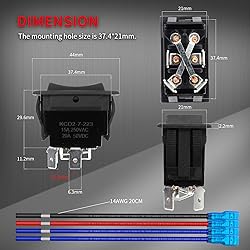【Polarity Reversing Switch】 This reverse polarity switch 12V is (ON)/OFF/(ON) DPDT 4 pin design. And the power jack switch comes with built-in jumper bars for polarity reversing. Just simply connect to battery and DC motor, then this RV rocker switch can reverse the motor direction without changing wiring. 【Heavy Duty & Momentary】 The rating of the polarity reversing switch is 30A 12V DC, 15A 24V DC. The heavy duty DPDT momentary switch will automatically return to OFF position after release, which is an ideal stabilizer jack switch. 【Easy Installation】 This RV jack switch is 1.47'' X 0.83'' (37.4 X 21mm) cut-out size and each comes with a set of wires. The RV stabilizer jack switch is snap-in design switch, which is easy to install and replace. 【Package Included】 The packge of the momentary switches 12V includes 2 x 12V DC RV electric jack switches and 2 x sets of connect wires (14AWG, 20cm). 【Wide Application】 This tongue jack switch can replace most RV / trailer power tongue stabilizer jacks, suitable for motor reversing control, fifth wheel jacks, power awning, etc.