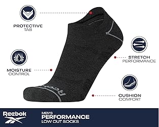 - Experience comfort and performance with these Reebok Men's Low Cut Socks. Crafted with 96% polyester and 4% elastane, these socks offer a perfect blend of durability and stretch. The low cut design ensures a secure fit, preventing slippage during activities. Moisture-wicking fabric keeps your feet cool and dry, while reinforced heel and toe areas provide added durability. Ideal for men's athletic activities, these socks come in a pack of six, ensuring you're always prepared. Machine washable for easy care.