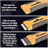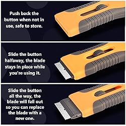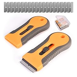 [Package Content] - Our single-sided razor blade holder scraper set includes 2 pcs window scraper with razor blade and 40 pcs additional metal scraper razor blades are provided for easy replacement. The razor blade scraper for glass can work for hard and soft surface without scratches, meet your various needs [High Quality] - The mini blade scraper is made through a hot injection molding process that contributes to the scraper and blade strength and rigidness, super strong, sturdy and durable [Easy to Use] - There is a retractable function makes paint scraper tool convenient to use and store. You can push the button to retract the blade when not in use. Just push the button forward to the far end to replace the blade [Ergonomic Design] - The razor blade scraper tool is adopted with an ergonomic curved and anti-slip handle design for comfortable hold and control. Easy to grasp and use, more labor-saving and improve the work efficiency [Multi-purpose Scraper Tool] - This flat sticker scraper tool is ideal for removing glue, vinyl, adhesives, debris, decals, signs, glue, stickers, labels, grease, and painting glass, car, enamel, wall, ceramic, tile, floor, metal and other surfaces. The scraper tools set can also remove residues from the oven, cooktop