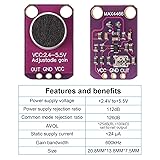 Application: MAX4466 microphone breakout is suitable for voice converters, audio recording and sampling, and audio response projects using FFT; On the back, there is a small trimmer pot to adjust the gain; You can set the gain from 25x to 125x Parameters: power supply voltage: +2.4V to +5.5V (can be compatible with STM, Raspberry Pi and other development board motherboards); Power supply rejection ratio: 112dB; Common mode rejection ratio: 126dB; AVOL: 125dB (RL = 100kΩ) rail-to-rail output; Quiescent power supply current: <24μA; Gain bandwidth: 600kHz 20-20KHz electret microphone soldered on: comes with a 20-20KHz electret microphone soldered on the board for audio-reactive projects; It is recommended to use the FFT driver library, which can take audio input and 'translate' it into frequencies Easy to use: connect GND to ground, VCC to 2.4-5VDC; For the good performance, use the 'quietest' supply available (this would be the 3.3V supply) Power supply noise rejection function: the amplifier has good power supply noise rejection