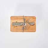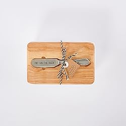 Three piece ceramic butter storage set arrives with butter dish, lid, and spreader. White ceramic butter dish has "My butter half" debossed along front and beaded detailing along bottom. Arrives with a pine wood lid Vintage style silver plated spreader reads "Pat on the back" that comes in a cut-out well alon lid. Size: dish 3" x 6 1/4" | spreader 5 1/2"