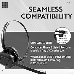 Dual Connectivity Package Deal : Work with Computer Softphones like Team, Zoom and Desk Phone Call. Professional Wireless Headset + USB-A Cable for Computer + Remote Hook Switch Device (EHS) for Polycom Phone Polycom IP 335 430 450 550 560 650 670 vvx300 vvx310 vvx400 vvx410 vvx500 vvx600 vvx1500 and CCX 350, 400, 500, 600, 700, Edge E100, E220, E300, E320, E350, E400, E450, E500, E550 Crystal-Clear Communication Anywhere, Two Year Warranty - With the Digital voice processing DSP wireless headset for phones DECT technology enabling an impressive 300 feet wireless range, the digital noise-canceling microphone ensures that others hear you clearly, filtering out ambient noise from your surroundings. Advanced Features, Enhanced Productivity - Our headset wireless utilizes digital voice processing DSP, ensuring superior sound clarity without Wi-Fi interference. Enjoy the PC & Desk headset intuitive features: Large Earpad, Elegant Magnetic Headset Charging Stand, Visual Glass Call Indicator, Busy Light Indicator Jack Newest 300 feet DSP DECT 6.0 Wireless Headset Technology with More Mobility and Reliance Than Bluetooth's limited 30-100-foot range, providing Dedicated Telecommunications, More Stable, Clear Call Quality. Wireless Phone Headsets for office Phones need DECT Tech Headsets. Max 12 Hours Talking, 50 Hours Standby Time : Maintain uninterrupted conversations with a generous 12-hour talk time, ideal for extended work sessions. The Long Lasting telephone headsets is the Essential Battery feature for Office Desk Phone Headset.