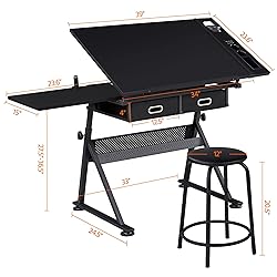 Overall dimension: Table: 120.5x60x(69.5-92.5)cm/47.5x23.6x(27.5-36.5)” (LxWxH); Stool: 30x51cm/12x20” (Dia.xH); Material: iron, MDF, PVC veneer, nonwoven fabric; Tilting tabletop angle adjustment: 0-60°; Table load capacity (max): 100kg/220.5lb All-in-one storage options: The drawing table has all you need for art/office supplies storage - an easy-to-clean detachable tabletop side tray with separate slots for different stationery items; a space-saving retractable board for documents/files; 2 simple yet practical nonwoven fabric drawers for mobile devices; an extra metal shelf down below for drawing drafts/paint cans. Adjustable table height: The height-adjustable drawing table measures 120.5x60x(69.5-92.5)cm/ 47.5x23.6x(27.5-36.5)” (LxWxH) in overall dimensions. Rest assured that all the fittings applied (e.g. metal connectors, plastic knobs and more) work well to ease your every single adjustment. Easy angle control: The artist table can be tilted at an angle range of 0-60°. It can work as a regular flat table for your laptop tasks or a professional drafting table for your art interests. The 100% tested adjustment system makes it easy for you to control the angle at your will. Table/stool set: This drafting table set includes a stool in the package, which features a sturdy construction of a well finished metal frame and color/style matching black PU-wrapped sponge padding round seat. Now enjoy the added comfort!