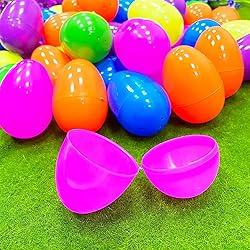 3.1 inch 50 Count Plastic Jumbo Easter Eggs in 6 Assorted Spring Bright Colors(Green, orange, purple, red, cyan, blue). Size 3.1" Tall x 2" Wide. 6 Colorful surprise Easter Egg included for special treats, which will bring some extra sparkle and cheer to your Easter celebration. Custom Designed Hinge Keeps Tops and Bottoms Together. Don't worry about egg shells being easily lost. Fillable Easter Eggs you can fill with specific treats, candy, miniature toys, cash, and more Surprises for a delightful Easter surprise! Endless Fun for Easter Eggs Hunt,Easter Basket Stuffers, Easter Decorations, School Classroom Supply, Easter Party Favor Supplies, Easter Goodie bag, Easter Toys Prizes, Teacher Treats, Easter Gifts,etc.
