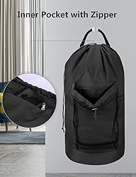 LAUNDRY CAPACITY - Measures 13"(diameter) x 29", this size is big enough for holding 2-3 loads of laundry. Perfect capacity for laundromat use or family use. Note: Tight a knot over the drawstring cord lock to ensure nothing lost when the laundry bag is full. ADJUSTABLE AND WIDE SHOULDER STRAPS - Fully adjustable shoulder straps and torso length to fit a wide variety of people, which can be extended to 28.4" at the longest. With the width of 1.9", it provides maximum support to your shoulders, relieving your shoulders from heavy weight. More convenient and comfortable than holding a bulky laundry basket back and forth between home and laundromat. EXTERNAL MESH POCKET AND INNER POCKET WITH ZIPPER - Designed with front mesh pocket(13" x 9") with drawstring closure, provide extra storage space for laundry detergent or fabric softener. And inner pocket (6.3" x 7") with zipper for cell phone, coins or cash change. PREMIUM FINE QUALITY MATERIAL - Made of tearing-resistant and durable 600D oxford cloth, waterproof and machine washable, sturdy enough to bear 44lbs of laundry. Reinforced stitching on each joint ensures that the seams do not torn open easily. Make sure longer lifespan and durable use. USE AS HANGING HAMPER - Hang this laundry backpack on the wall or door as hanging laundry hamper with the reinforced hanging loop on the bag to collect dirty laundry. Suitable for college, camping and home.