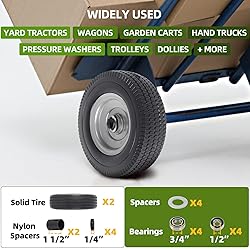 AR-PRO 10x3.50-4" SOLID TIRE AND WHEEL ASSEMBLIES - These Solid PU Run-Flat tire and wheel assemblies are the perfect replacement parts for 4.10/3.50-4 wheeled equipment with wheels that have an outer diameter of around 10 inches, rim diameter of 4 inches, and tire width of 3.50 inches, 2.25 inches offset hub. 10" SOLID TIRES AND WHEELS FOR UTILITY EQUIPMENT - 10 Inch solid wheel highly compatible with yard tractors, wagons, wheelbarrows, hand trucks, dollies, trolleys, lawn mowers, and more! Convert now to more efficient and maintenance-free tire and wheel assemblies! (Please note: Not suitable for long-term static parking.) 5/8" BEARINGS AND FREE ADAPTER KIT 3/4"&1/2" BEARINGS AND SPACERS - The wheel assembly has an axle borehole inner diameter of 5/8 inch that will universally fit on 5/8-inch axles. Each pack includes 3/4 inch bearings (2pcs); 1/2 inch bearings (2pcs); 1/4 inch long spacers (2pcs); 1-1/2 inch long spacers (1pcs); and metal spacers (2pcs). HEAVY-DUTY SOLID PU TIRE AND WHEEL ASSEMBLIES - The layered 100% premium PU ensures that the rubber tires can perform excellently under heavy-duty applications. The solid and durable construction ensures that the tires are wear, puncture, tear, and rot-resistant. The rims are steel with solid metal hubs that resist impact cracks and suitable for all-terrain use. SAFE AND COMFORTABLE TUBELESS TIRES AND WHEELS - Sharp debris and punctures are no issues for these flat-free solid rubber tires. Not only that, they can perform on terrains where pneumatic tires can easily fail. They are best for utility equipment that operates on rough terrain and requires rough handling. There’s no risk of flats, explosive punctures, and pinched inner tubes!