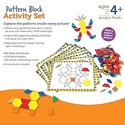 MASTER early geometry skills while making creative pictures! EXPLORE 40 progressive design challenges that grow with your skills! INCLUDES 20 double-sided design cards filled with artsy STEM challenges! MAKE your own creations with 124 plastic pattern blocks! . AGES 4+ GIVE THE GIFT OF LEARNING: Whether you're shopping for holidays, birthdays, or just because, toys from Learning Resources help you discover new learning fun every time you give a gift! Ideal gift for Halloween, Christmas, Stocking Stuffers, Easter Baskets Stuffers or even for Homeschool.