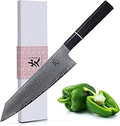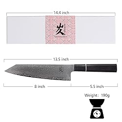 【High-Quality Blade】: This japanese chef knife is made of 67 layers of VG-10 high-carbon stainless steel (HRC 60±2). The high-quality steel improves the hardness of the blade and is easy to maintain. It has very good durability, anti-rust, anti-corrosion, and does not change color. Very suitable for all kinds of slicing, dicing and shredding. Easily complete your daily kitchen work. 【Super Sharp 8 inch Chef's Knife】: This japanese kitchen knife has ultra-sharp edges and perfect arc (10-15° on each side), which meets all the chef's requirements for the knife. Each knife is carefully processed and forged and vacuum heat-treated and polished through multiple processes to achieve the best balance of hardness, toughness and sharpness, providing unparalleled performance. 【Octagonal Ebony Handle】: This professional chef knife uses ergonomic octagonal ebony handle is very comfortable, providing excellent grip and perfect balance, excellent control, agility and comfort. The proper balance weight between the handle and the thin blade ensures easy movement. Even if you use it for a long time, no matter your hand size, left or right or holding position, you will not feel tired and uncomfortable. 【Wide Range of Uses】: This japanese cooking knife can easily handle your daily kitchen work. You can cut, slice, dice and chop all kinds of meat, fish, vegetables, fruits, bread, sushi, etc. It is suitable for Home and restaurant kitchen. 【Perfect Gift】:Comes with exquisite high-end white gift box packaging! If you are looking for a unique and exquisite gift, then this Damascus knife is a good choice. The perfect gift for home chefs and cooking enthusiasts, mothers, fathers, grandparents, friends or yourself.