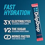 FAST & EFFECTIVE HYDRATION: Combat dehydration with our science-based electrolyte powder formula that hydrates faster than water alone. Perfect for sports, outdoor activities, and hot days. 3X ELECTROLYTES & ½ THE SUGAR: Our precise formula activates a hydration shortcut, delivering essential electrolytes with less sugar than leading sports drinks. A great-tasting hydration powder that's easy to drink and mix. HEALTH-CONSCIOUS FORMULA: Non-GMO, Gluten-Free, Vegan, Soy-Free, Dairy-Free and Kosher. Our hydration packets include essential nutrients like potassium, magnesium, zinc, and vitamin C for added immune support. Natural colors derived from sources including fruit and vegetable juices, turmeric, spirulina extract, and beta carotene. No FD&C colors ever (no Red 40). CONVENIENT SINGLE-SERVE PACKETS: 16 portable electrolytes powder packets perfect to rehydrate on-the-go. Ideal for travel, sports activities, and daily use. Mix 1 packet into 8 oz of water for effective hydration. TRUSTED BRAND WITH A MISSION: Created by a doctor, DripDrop is a groundbreaking innovation that earned a Mayo Clinic Humanitarian Award. As a Public Benefit Company, every purchase supports our mission to defeat dehydration with global donations of our product. DELICIOUS FLAVOR: Awarded Men's Journal Fitness Award for the Best-Tasting Hydration Drink. Explore our many flavors and find your favorite electrolyte drink!