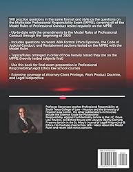 - These 500 sample questions have the same format and style as the questions on the current Multistate Professional Responsibility Exam (MPRE). The multiple-choice format also provides a useful way to test students’ knowledge of each provision or clause in each of the American Bar Association's Model Rules of Professional Conduct, as well as the ABA official Comments (which the MPRE tests along with the Model Rules themselves). Questions also cover recent ABA Formal Ethics Opinions and sections of the Restatement (Third) of the Law Governing Lawyers that are most relevant for upcoming MPRE exams. No other MPRE practice book currently on the market has as many sample questions, or as broad coverage, as this book. The practice questions are also extremely useful in mastering the material covered in every Professional Responsibility/Legal Ethics course, which is a required course at every American law school. The arrangement of topics in this book follows the order of how heavily the MPRE tests each Rule. An Index helps students find the sections devoted to individual Model Rules in case their Professional Responsibility course arranges topics in a different order. NOTE: THIS BOOK DOES NOT CONTAIN EXPLANATIONS. Most questions have a citation or reference immediately beneath the question to the specific Model Rule provision, Comment, Restatement section, or case that will explain the question and the correct answer. Professor Stevenson's YouTube channel has corresponding video lectures about each rule. Customers wanting a book with complete explanations for every question should get the author's Glannon Guide for Professional Responsibility.