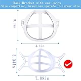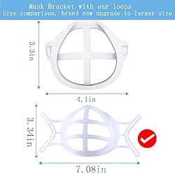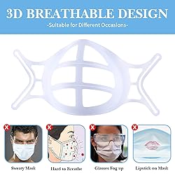 - Product: plastic Face Mask inserts Bracket Breathe Cup Wearing a mask for a long time will become more and more stuffy, making it more difficult to breathe, so how to wear a mask more comfortably? Our 3D Mask Bracket with Hooks better for Fastening Cool Mask Guard, mask insert can hold up the mask fabric around the mouth. You will feel cool and easy to breathe even though with a mask on face. Product specifications Material: Safe, recyclable, non-toxic, and tasteless Product Size: 7.08x3.54x1.57in Product weight:0.23oz / 6.5g Color: white Packing List: 3D plastic Bracket Install Step: 1.Take out 3d face mask bracket and mask 2.Insert mask string into the buckle of the 3d face mask bracket 3.Adjust mask for yourself 4.Wear mask normally What benefits you can get ? Comfortable: Ergonomic design for different facial shapes, gentle on the skin. Convenience: Can be folded arbitrarily Silicone Mask Bracket,Palmsize, easy to put it into your pocket when you go out and does not take up space. Security: Prevent dust, without touching with mouth and nose directly, reserve more breath space. Note: Package includes 3D Breathe Cup for Mask only, other accessories demo in the picture is not included. Light shots and different displays may cause the colors of items in the picture to differs lightly from real objects.The measurement tolerance is 1-3mm.