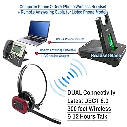Dual Connectivity for Cisco Desk Phone & Computer Phone Professional Telephone Wireless Headset. Digital voice processing DSP, Remote Hook On and Off, Incoming Call Alert, Large Earpad, Elegant Magnetic Headset Charging Stand, Visual Glass Call Indicator, and Busy Light Indicator Jack Crystal-Clear Communication Anywhere, Two Year Warranty - With the wireless headset for phones DECT technology enabling an impressive 300 feet wireless range, the digital noise-canceling microphone ensures that others hear you clearly, filtering out ambient noise from your surroundings. Package Price Deal : Work with Computer Softphones like Team, Zoom and Desk Phone Call. Professional Wireless Headset + USB-A Cable for Computer + Remote Hook Switch Device (EHS) for Cisco 6945 7942G 7945G 7962G 7965G 7975G 7821 7841 7861 8811 8841 8845 Newest DSP DECT 6.0 Wireless Headset Technology with More Mobility and Reliance Than Bluetooth (less 100 feet, occasional drops in call) provides Dedicated Telecommunications, More Stable, Clear Call Quality. Wireless Phone Headsets for office Phones need DECT Tech Headsets. Max 12 Hours Talking, 50 Hours Standby Time : Maintain uninterrupted conversations with a generous 12-hour talk time, ideal for extended work sessions. The Long Lasting telephone headsets is the Essential Battery feature for Office Desk Phone Headset.