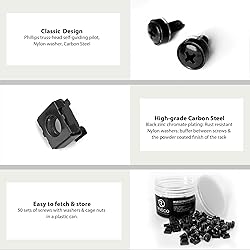 High quality carbon steel. Solid and durable. The M6 network rack screws feature a Philips truss-head with self-guiding pilot points . Screws size: M6 * 16 mm, equals M6 * 0.65 inch; pre-installed nylon washers to prevent scratching equipment; cage nuts are designed for square holes on racks & cabinets usage. 50 sets in each plastic can. Zinc chromate plating to prevent rusting, with firm finishing. Broadly used for standard 19” equipment mounting on cabinets & racks like servers, routers, rack shelves, blank panels, NAS & amplifiers.