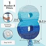 Birthday Pinata: Designed for kids ages 3-14, this ombre blue pull string pinata is ideal for a 8th birthday, 8-month milestone, school event, or themed party. Use it as a fun game or a festive centerpiece for any celebration Easy To Fill: You can easily fill the number 8 birthday pinata with fun and festive items (around 2.5 lbs) such as small toys, candy, chocolate, or confetti via the label on the top (fillers not included) Fun for Everyone: Guests can take turns pulling the ribbons from the pull string pinata until one ribbon finally releases the contents inside, creating a fun baby shower game for all to enjoy Compact and Convenient: This lovely ombre blue pinata number 8 measures 16.5 x 11 x 3 inches and features a plastic tie at the top for easy hanging from a tree, railing, or ladder What's Included: You'll receive a number 8 piñata with a loop on the top for easy hanging and an easy-to-cut hole so you can fill it with candy and pinata filler