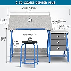 - The Comet Center Plus by Studio Designs provides a comfortable work space and keeps your craft and art supplies easily accessible. The table top's angle adjusts up to 40 degrees and includes a 24’’pencil ledge that slides up and locks into place when needed. The set also features three adjacent storage drawers, a wide shelf under the table top. The durable heavy gauge steel construction includes six floor levelers for stability. Main work surface: 36’’W x 23.75’’D. Overall dimension: 50’’W x 23.75’’D x 29.5’’H