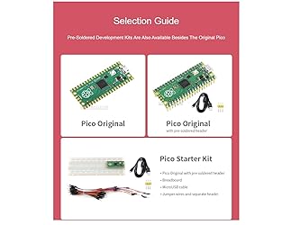 • Overview Raspberry Pi Pico, A Low-Cost, High-Performance Microcontroller Board With Flexible Digital Interfaces.Raspberry Pi's first microcontroller board,Incorporates RP2040 Microcontroller Chip Designed By Raspberry Pi. This is the Raspberry Pi Pico with Pre-soldered Header . Features RP2040 microcontroller chip designed by Raspberry Pi in the United Kingdom Dual-core Arm Cortex M0+ processor, flexible clock running up to 133 MHz 264KB of SRAM, and 2MB of on-board Flash memory Castellated module allows soldering direct to carrier boards USB 1.1 with device and host support Low-power sleep and dormant modes Drag-and-drop programming using mass storage over USB 26 × multi-function GPIO pins 2 × SPI, 2 × I2C, 2 × UART, 3 × 12-bit ADC, 16 × controllable PWM channels Accurate clock and timer on-chip Temperature sensor Accelerated floating-point libraries on-chip 8 × Programmable I/O (PIO) state machines for custom peripheral support Package Content Raspberry Pi Pico with pre-soldered header x1 1*3PIN yellow pin header x1 USB-A to micro-B cable x1 Note Technical Support is provided , please contact us if you have any problem .