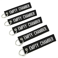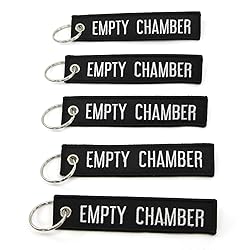 - Our EMPTY CHAMBER Keychains are 100% embroidered, with merrowed borders. Key ring is nickel plated for long lasting durability. These key chains would look great on your firearms case.Large embroidered letters are 5/8 inch tall, or 15mm.This pack includes 5 pieces : Black fabric with White embroidery