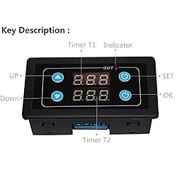 • 1. Parameter: N.O Parameter Value 1 Timing Range 0-999ms,0-999s,0-999m,0-999h 2 Supply Voltage AC 85-265V 3 Installed Size 71*39*23mm L*W*H 4 Power dissipation <0.6W 5 Maximum Power <2000W 6 Maximum Current 10A 2. Function: ​ 1>. Timer 2>. Delay 3>. Cycle 3. Application: 1>. It can be widely used in many regular occasions. 2>. It can be widely used in industrial control. 4. Features: 1>. It has double LED displays, so you can set two timing time T1 and T2.It will very convenient to customers. 2>. There are three timing time for your choice: 0-999s,0-999min and 0-999h. You could set the timing mode as your requirement. 3>. There are six operating modes for your choice. 5. Instructions: Please pay attention for your first use. You need wait 6s after your setting data, the module will save the date you have set after 6s. Short press button ‘SET’: Start the Time Setting Mode and scre