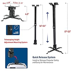 🎬【Upgraded cable management, safely contained】 The projector mounts adopt a large square tube design which helps keep HDMI, audio, and video cables concealed and organized, power cords and cables safely contained, keeps everything clean and organized, eliminate hazards due to tangled or stray electrical cables. 🎬【Newly Designed 3-In-1 retractable】 1. Flush ceiling installation(minimum length: 4.5"), 2.Telescoping arm ceiling installation(height adjustment range: 16.9"-25.6"), 3.Wall-mounted installation(extension range: 16.9"-25.6") 🎬【Adjustable height, load capacity 44 lbs】Heavy-duty commercial-grade steel construction and connect with a universal head, not a single hole, weight tested at 44 lbs to ensure projectors are in strong arms. Fully adjustable with 15-degree rotation horizontally (X-axis) to the left or right, 15-degree tilt vertically (Y-axis) up or down, highly maneuverable to help you get the most potential out of your projector. 🎬【Quick release and no-slip】 The projector hanging mount is easy to install or disassemble with quick-release hooks which allow dismounting for servicing of filters and bulbs but notice still requires unscrewing 4 bolts to release the projector for security and stability. Exclusive "no-slip" adjustment system, lock in any position, easily release and lock. 🎬【Universal mounting design】 Compatible with the projector models which have 3-4install holes and the mounting hole distance ranging up to 14.2 inches. This projector hanger is perfect for use in classrooms, boardrooms, hotels, home cinema, restaurants, or anywhere a projector needs to be mounted. Tips & Support: Before purchasing, make sure the projector has 3-4 install holes, and the diameter of the screw holes is 3 mm, 4 mm, or 5 mm. And this projector mount does NOT support the vaulted ceiling and drywall. If you have any questions about the product, we’ll work to resolve your issues within 24 hours.