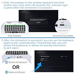 - Wireless Keyboard for PS5 Controller Connection Instructions: 1, Connect your bluetooth keyboard to your wireless controller via the controller 3.5mm jack. 2, Turn on your system for PS5 and wireless controller. 3, Turn on the keyboard with the On/Off switch- the blue indicator will light up. 4, Press and hold the Pairing Key for 3 seconds to begin pairing the device. The indicator will flash until pairing is completed. 5, On the system, go to "Settings", then "Devices", then "Bluetooth Device". 6, Find the device named "JYS Bluetooth Keyboard" and then select to pair. 7, Enter the passkey displayed by your console and then select it to pair with your controller. Package Included: 1 x Wireless keyboard for PS5 controller 1 x Manual NOTE: For PS5 controller does NOT include. Cable NOT include.