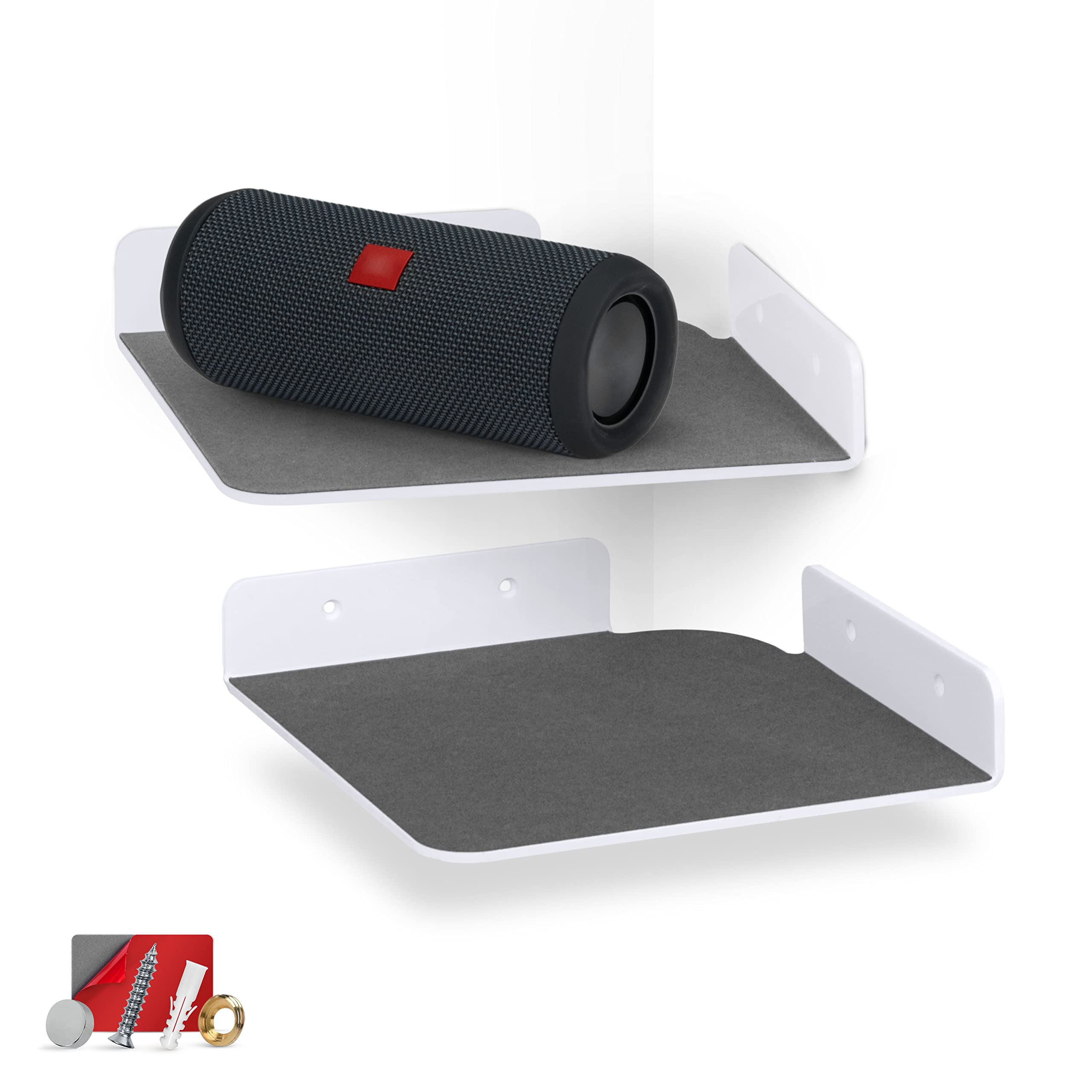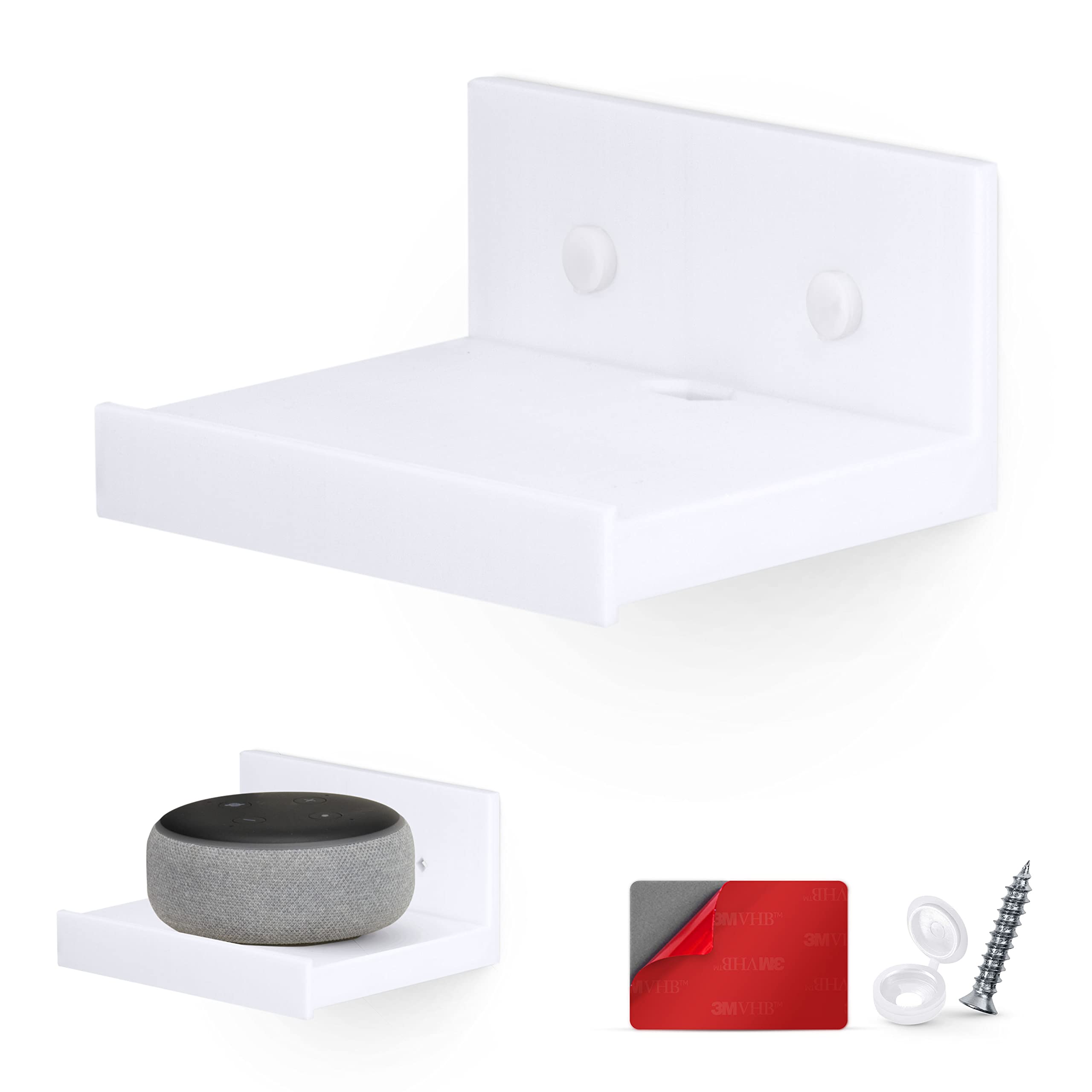 - Description Details Notes | Fitting Guide LARGE UNIVERSAL FLOATING SHELF WALL MOUNT HOLDER: Easily place your small devices like the Google Nest Cam, Wyze Cam, Arlo Pro Pro3, DXR-8 Baby Monitor, Google Home Mini, Echo Dot, Bose SoundLink, security cameras, plants, speakers, collectibles, action figures & much more in any location you choose. MAKE NEW SPACE: Make use of empty space with our simple floating shelves, convenient wall mounted storage, with raised edges for that little extra assurance. Can fit anything up to , and no bigger than 2lb / 900 grams in weight . 118mm / 4.6â x 108mm / 4.2â UNIVERSAL SHELF: Display and store your action figure collection, Funko Pops, small plants, collectibles, model kits, personal hygiene essentials and much much more, all around your home - keep things safe, secure and accessible, or just hang them up to show them off, it's up to you. ROUNDED DESIGN: The rounded front on the base allows for bigger items to be seated, perfect for speakers, house plants and other circular items up to 4.2â deep, plus it also gives the shelf a smooth and clean look too. 3M VHB STRONG TAPE: Brainwavz floating shelves are simple to hang with no tools or screws required. We use only the best 3M VHB tape to mount the shelves on a variety of surfaces. Just peel off the red backing from the 3M VHB tape, affix our wall mount in the desired location, let it set for a few hours and youâre ready to go. DO NOT PLACE ON PAINTED, DAMP OR PLASTERED WALLS, PAINT OR PLASTER MAY COME OFF. WHATS INCLUDED 1 x Shelf 3M VHB Tape - Pre-Attached DIMENSIONS Overall Size: 127mm / 5" x 121mm / 4.7" Usable Shelf Space: 118mm / 4.6" x 108mm 4.2" Read our 3M user guide here Ensure you attach the shelf as per the instructions or your shelf will not preform to the best of its ability All images are for illustration purposes only. IMPORTANT: DO NOT PLACE ON PAINTED, DAMP OR PLASTERED WALLS, PAINT OR PLASTER MAY COME OFF ALL