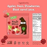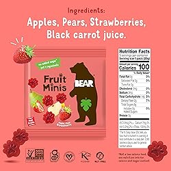 Contains 18 packs of BEAR Fruit Minis; Strawberry We’re proud to say that our fruit snacks are Non-GMO Project Verified, Gluten Free, Kosher, Vegan, and Paleo We gently bake our fruit rolls to ensure they’re jam packed with vitamins, minerals, and fiber Perfect for lunchboxes, backpacks, or simply just a great on-the-go healthy snack Our fruit snacks are also completely free from concentrates, added sugar, preservatives, stabilizers, and gumming agents. What you see is what you get.