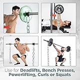 - Exercise your back, legs, core, arms, hips and shoulders to build up strength and endurance. A perfect way to effectively target different groups of muscles, the LoGest Weight Lifting Gym Chain with Collars are easy to use so you can engage in a productive workout session at any time. Each exercise chain is durably crafted using high-quality material to ensure long-term durability, coming complete with a collar for easy attachment to an Olympic barbell. Connect a Weight Lifting Workout Chain to each end of an Olympic barbell to add scalable resistance to your lifts. Once you place the chains on your barbell, you can perform deadlifts, bench presses, powerlifting, curls or squats to increase muscle contraction and performance. As you lift the bar, the weight of the weight chains for bench progressively increases as more of the chain gets lifted off the floor. Providing maximum muscular stimulation throughout the entire range of motion, it will help you push past your lifting plateau! In addition to connecting this pair of weighted chains for workout to your barbells, you can also drape one – or even two – chains over your shoulders to engage in weighted pull-ups, dips, lunges and virtually any type of exercise. It’s a great way to increase strength, allowing you to effectively target your back, legs, core, arms, hips and shoulders through a variety of different exercises. Each Weight Powerlifting Chains measures 46 inches in length and comes with a steel black collar for easy attachment to and removal from a 2-inch Olympic barbell. Simply slide the collar onto the barbell, then use the L-shaped screw to secure the lock and hold the collar in place. You can then easily attach the chain to the collar using the spring snap on top.