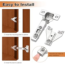 Full overlay 105 degree clip on concealed hinge. Cup size:35mm*11.5mm, Range For door thickness:14-22mm Fit for cabinet with Frame. Made from zinc alloy with a nickel plated finish for long-lasting durability. It is useful for kitchen cabinet doors, wardrobe, tv cabinets, bookcases, wine, and other door connection Easy to install to your furniture. Mounting screws and plates are contained,perfect for the replacement of old cabinet hinges.