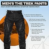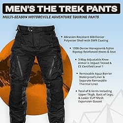 - Embark on your next adventure with confidence and style in the Tourmaster Men’s Trek Motorcycle Pants, expertly designed for multi-season touring. Constructed from durable 600D polyester with a DWR coating, these pants offer superior abrasion resistance and protection against the elements. Reinforced with 1000D Honeycomb nylon ripstop at the knees and seat, they ensure maximum durability in high-impact areas, while soft leather inner legs provide additional grip and protection against engine heat. The Aqua-Barrier breathable waterproof zip-out liner and separate zip-out thermal liner deliver optimal comfort and adaptability in changing weather conditions. Featuring CE-certified Level 1 knee armor with three-way adjustability, along with removable EVA foam hip pads, these pants prioritize your safety without sacrificing comfort. The elastic waistband with adjustable waist belts, dual-snap and zipper fly closure, and 4-way stretch fabric ensure a secure and flexible fit, allowing for unrestricted movement. With six strategically placed vents for enhanced airflow, waterproof hand pockets, and large cargo pockets for convenient storage, these pants are designed to meet the demands of any adventure. Reflective accents enhance visibility in low-light conditions, and genuine SBS waterproof zippers ensure reliability. Complete with a full-circumference pant-to-jacket attachment zipper, the Tourmaster Men’s Trek Motorcycle Pants are the ultimate choice for riders seeking performance, protection, and versatility.