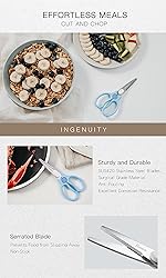 Made from premium quality SUS420 stainless steel,specially treated with anti-rusting properties. Jagged blades design to prevent food from sliding when cutting Patented Safety button to lock blades in place to prevent misuses Handles are integrated with nut cracker design to help crack shells, crab legs, and … Including holder to keep the scissors clean and safe when on the go.