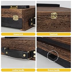 PRACTICAL & RUSTIC DESIGN- Our desktop easel storage paint wooden box has a rustic vintage finish that is both modern and classic. Its a great stand to use by kids, art beginners, students, artists and anyone who needs organizing while painting, drawing and writing HIGH STORAGE - 3 compartments drawer that will hold all multipurpose items. Store paint tubes, brushes, pencils, tools and other art supplies with clasps to keep the products from staying securely in place and from getting lost. *NO PAINTS AND CANVAS INCLUDED PORTABLE EASEL FOR PAINTING - Great leather handles to easily carry all painting products inside. Fold down the easel into a compact box and convenient to move around when working in different indoor and outdoor places. ADJUSTABLE ANGLE- Our unique tabletop and desk easel can be adjusted to 3 different angles settings for optimal eye level. Helps have a comfortable working station for when drawing, painting, writing, reading and more. HIGH QUALITY- Made of quality paulownia wood , which is durable, thick and lightweight. The wooden easel box will sturdily and neatly hold all your painting tools and hold canvas, books securely in place