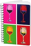 WINE TASTING JOURNAL: Spiral bound notebook designed specifically for recording wine tasting notes, assessments, and ratings to track your wine experiences and preferences over time INTEGRATED FLAVOR WHEEL: Features a comprehensive wine flavor wheel reference guide to help identify and describe the complex tastes and aromas in each wine you sample STRUCTURED RATING PAGES: Pre-formatted pages include sections for wine details, color and appearance, taste spectrum, body, balance, finish, overall experience ratings, and personal comments VIBRANT POP ART COVER: Eye-catching cover design featuring colorful pop art style wine glasses in pink, navy, green, and red that makes this journal stand out CONVENIENT SPIRAL BINDING: Durable spiral binding allows the journal to lay flat for easy writing during tastings and keeps all your wine notes organized in one place