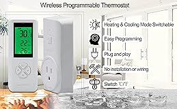 💚Remote thermostat with a highly accurate temperature sensor. The temperature is detected automatically by the thermostat outlet. It can be used in the remote and the outlet in different rooms (space). For example, if you want to control the temperature in the basement, you can put the outlet in the basement, place the remote control anywhere within 101 meters (bedroom, kitchen, living room, etc.), remotely set, control and see the temperature of the basement. ❤️💜【ON/OFF manual button on the outlet】: Standard U.S. outlet plug, high quality, can also manually turn on/off the outlet. ❤️💜【Application】This wireless thermostat can help you control the room temperature accurately. Suitable for attic fan, swamp cooler, evaporative cooler, space heater, wall panel heater, electric fireplace heater, basement, bedroom, window AC, garage, greenhouse, etc. 🎄💛【Free to switch between ℃/℉, Easy to use and program】: Only 2-step settings for your application, just plug-in and select heating/cooling system, then this temperature controller auto-match and play with your home device. 💚💜【Heating & Cooling Mode】: Automatically turn on/off heating devices or cooling devices through your preset target temperature. When the current temperature reaches the target temperature, the thermostat plug stops heating or cool. Maintains stable room temperature and provides comfort and energy saving. High and low-temperature alarms are available, 3-Prong socket with grounded terminal, safe and reliable. The maximum load can reach 12A, 1300W.One-year warranty!