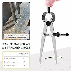 - Keadic 3 Pcs 4'' 6'' 8'' Professional Metal Compass Set, Steel Adjustable Lockable Divider Wing Compass, Drafting Compass Tool for Leather Work, Woodworking, Metalworking, Geometry Drawing Product Specification: Quantity: 3pcs Material: Steel Size:4’’/6’’/ 8’’ Premium Metal Scribe Compass:Finely threaded for quick adjustment; Rivet design for stability. Hard point tip for accurate draw. Fine polishing, comfortable hand feel, accurate measurement. Accurate Draw: The hard and sharp tip of the compass can be firmly fixed on the horizontal surface of the leather and wood for accurate drawing. Convenient to Use:Spring tension and lockable sliding nut allows for quickly measure, copy measurement, repeat measurement, measurement transfer and repeated circle drawing. Adjustable Wing Compass: The wing divider compass is adjustable. You could adjust the width between the two legs to meet your different needs. How to Adjust the Wing Divider: ① adjust the required with by turning to the screw. ② Adjust the space between two legs. Wide Application:Perfect for drawing arcs, circles, divide gauges, dividing line,making contours, line segments, size measurement, edge marks,etc. Widely applied in Wood Work, Carpentry, Metal Work, Leather Work, Math. Package Include: 1 pcs-----4’’ divider scriber tool 1 pcs-----6’’ compass scribe 1 pcs-----8’’wing divider compass Totally 3 pcs