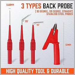 22PCS Back Probe Kit is for harness connectors, automotive sensors and fuel injectors. Back Probe is made of Stainless Steel ,15pcs with 3 kind (Straight, 90 degree, 135 degree) and five color. 5PCS banana plug(standard 4mm) with copper alligator clips wires, 5 colors to identify. 2 PCS Nickel plated copper Alligator clips. Back Probe can test up to 30 volts. easier use on automotive connectors.