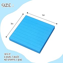 - Specifications: Quantity: 4 Pads/Pack, 90 sheets/pad Size: 3 x 3 inch 4 Bright Colors: Blue. Material: Paper. Package Include: 4 X Lined Sticky Notes.