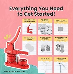 Versatile Crafting Tool: Create custom buttons and magnets effortlessly with the pin maker. Ideal for personal projects, events, or promotional items, this set works great as a magnet making machine and includes everything needed for button and badge creation. Easy to Use: The button press machine simplifies the button-making process, making it perfect for both beginners and experienced crafters. Each button maker kit includes all the supplies needed for quick and easy assembly. Multi-Use Button and Magnet Press: This button pin maker doubles as a badge maker machine, photo magnet maker machine, and magnet press machine — ideal for use with any pin making kit or button machine maker supplies. Complete Crafting Set: This 2.25-inch button maker kit includes 100 button sets, 5 bottle openers, 5 fridge magnets, 100 circular papers, a circle cutter, and 500+ downloadable designs — everything you need for fun, functional DIY projects. Fun for All Ages: The small button maker is great for kids and adults alike. Enjoy creative time with family and friends using pin making supplies that offer endless fun and memorable DIY projects.