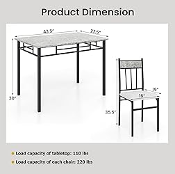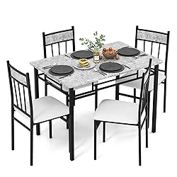 - Description:This kitchen dining table set is built with a strong steel frame and durable powder coating that resists rust, deformation and decay, ensuring its longevity. Besides, the chairs of dinette set are designed for comfort with sponge cushioning covered in PVC leather, and a tall backrest that follows ergonomic principles. Rectangular and flat design allows the chairs to be neatly tucked away under the table when not in use, perfect for small spaces and solo apartments. Additionally, the modern faux marble tabletop is scratch-resistant and waterproof, making it easy to clean and maintain. With high-quality accessories and a clear manual for assembly, putting together this dining set is a breeze. Ideal for families members to have afternoon tea, breakfast and daily meals, this set is a practical and stylish choice for all kinds of kitchen or dining rooms.Features:Modern simple style dining table set adds elegance touch Solid steel frame with powder coating ensures durable and long-lasting structureEasily tuck the stools under the table for space saving Scratch-resistant veneer tabletop, which is smooth, waterproof and easy cleaningSpacious marble pattern tabletop provides abundant space for having meals togetherThickly upholstered seat cushion with PVC leather enhances more comfortErgonomic backrest supports your back comfortablyModern elegant appearance, beautiful decor for your roomSuitable for dining room, kitchen, restaurant, bistro, office, etcSpecification:Color: Gray Faux Marble PatternMaterial: MDF, PVC, SteelTable dimension: 42" x 27.5" x 30" (L x W x H)Chair dimension: 15.5" x 18" x 35.5" (L x W x H)Net weight of table: 29 lbsNet weight of chair: 9 lbsWeight capacity of table: 110 lbsWeight capacity of chair: 220 lbsPackage includes:1 x Table4 x Chairs1 x Instruction