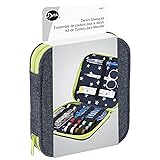 Stylish kit with navy denim fabric on the outside with a playful patterned print on inside Size is a convenient to store in home or dorm room and small enough to use for travel A bright lime zipper provides complete closure to the case and the elastic bands on inside secure products in place keeping your kit organized and tidy INCLUDES: 1 Zippered Case; 1 Small Blade Scissors; 1 Seam Ripper; 1 60" Tape Measure; 1 Size 10 Thimble; 1 Clear Plastic Box with 1 Needle Threader, 6 White Buttons, 6 Safety Pins & 20 Glass Head Straight Pins; 1 each of White, Pink, Red, Blue, Brown, Gray, Green & Black Spools of Thread; 1 Needle Holder with 25 Hand Needles.