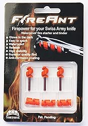 • The FireAnt is a patented fire starting tool that fits into the corkscrew of Victorinox Swiss Army Knives. Paired with the included Helix Tinder these make a complete and 100% waterproof fire starting system. A true life saving tool! One FireAnt can last for several hundred fires when used with Helix Tinder. Helix Tinder Helix Tinder is a patent pending wax impregnated waterproof fiber tinder that integrates with the FireAnt into the corkscrew. Each Helix Tinder can be cut or pulled apart and used for multiple fires. Glow in the Dark: The FireAnt glows in the dark to help you locate your knife at night. 100% Waterproof: The FireAnt and Helix Tinder are 100% waterproof and have been tested to work even after being submerged in water for over 4 months! *The FireAnt fits into all modern Victorinox Swiss Army knives, but may not fit into older grooved style corkscrews.