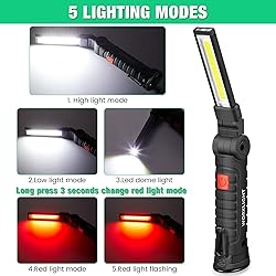 Package contents: you will get 4 pieces of LED work lights; The COB design of our LED flashlight will increase lumen-output for each space, giving you brighter light with greater energy efficiency; The sufficient quantity can meet your daily use and replacement needs, also you can share them with others Quality material and water-resistant feature: this rechargeable work light is made of hard rubber, with anti-sweat and anti-slip function; The head is composed of aluminum, which dissipates the heat effectively and resists to water, prolongs the life of the lamp; Please do not put it into water 5 Different working modes: portable inspection light has different 5 lighting modes for choosing, namely, high brightness, medium brightness, front light, red warning, strobe red Equipped with magnetic base and hook: this LED work flashlight has a magnet base; The bottom also has a hook, so it is able to be hung on wall, giving much convenience while using Wide applications: this COB LED work light is widely applied in many circumstances, proper for working, repairing, camping, mechanics, nurses, doctors, outdoor sports, traveling, hiking, workshop, garage, power outages, home lighting, work at night; There are more suitable occasions waiting for you to find out