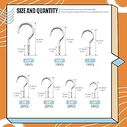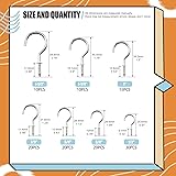 - ▶Rustark Screw-in Cup Hooks Kit, 7 Sizes Ceiling Small Hooks for Hanging Outdoor or Indoor Use (1/2” 5/8” 3/4” 7/8” 1" 1-1/4” 1-1/2”) ✅Product Specification -- Color: Silver -- Material: Steel -- Package Quantity: 125pcs -- Sizes: ①1/2”,②5/8”,③3/4”,④7/8”,⑤1", ⑥1-1/4”, ⑦1-1/2” ✅WHY CHOOSE US? ●Premium Material - Made of high quality steel with rust-resistant coating on the surface. Smooth, solid and sturdy for long lasting use. ●Multiple Sizes Available - Our cup hooks are available in 7 different hook sizes. They will meet your hanging projects at home, office, garage and more. ●Easy to install - Features with adequate threading, thus easy to screw in without slipping. Before installation, it is recommended to drill a suitable pilot hole. Ideal for indoor or outdoor use. ●Versatile Use - Great for hanging mug, kitchen utensils, plant, ceiling decoration, string lights, lantern, curtain, necklaces, etc. ✅Package Includes: <1>30 x 1/2” Screw-in Cup Hooks <2>20 x 5/8” Screw-in Cup Hooks <3>20 x 3/4” Screw-in Cup Hooks <4>20 x 7/8” Screw-in Cup Hooks <5>15 x 1" Screw-in Cup Hooks <6>10 x 1-1/4” Screw-in Cup Hooks <7>10 x 1-1/2” Screw-in Cup Hooks Total: 125pcs ♥WARM TIPS: -Please always keep the tiny and sharp parts away from children. -Before installation, it is recommended to drill a suitable pilot hole for good performance. -If you come across any questions or problems, please feel free to come to us. We will solve it for you as soon as possible!