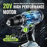 Perfect present for Christmas, Birthday, Anniversary, Valentine's Day, etc Efficient Drill with High-Performance Motor: This 20 V Cordless Drill Driver provides 354 IN-LB(40 NM) MAX POWERFUL TORQUE and allows you to select between 2-speed settings (0 – 410 RPM or 0 –1750 RPM), so you will always have the power you need, high performance & stable motor makes the work faster, easier, more enjoyable. WORKPRO impact drill set makes everything easier than before, a formidable all-around helper for matching your desires, perfect for professionals and DIYers Powerful Impact Drill & 21+2 Torque Selector: The 20V Cordless Drill with impact function exerts high-frequency vertical impact (23000 BPM max) while drilling, making drilling in Brick, Cement Wall, and Concrete more efficient. 20 V Cordless Drill with a total of 21 different torque settings and 3 in 1 working modes (screw driving, drilling, impact drilling), allows you to select different speeds depending on the task at hand and helps you complete a wide range of applications 2*2.0 Ah Fast Charging Battery & LED Light: The cordless drill kit combines a highly powerful motor with a 2*2.0 Ah Li-ion battery, you will get outsized performance and never need to worry about running out of power in the middle of a project as long as you keep the spare charged up. A fast charger(2.4 A) can charge one battery in as little as 1 hour. Trigger-activated LED light illuminates any enclosed workspace and escapes the shackles of darkness Comfort Operate & Convenient Carry: WOKPRO Lightweight Drill Driver Kit features soft rubber and ergonomic anti-slip grip handle, extremely comfortable to hold and use, reduces hand fatigue at long time work, and little convenience features, such as the belt hook and sturdy case. All accessories are neatly arranged in this portable case, and easy to pick up, no need to worry about a cluttered work area or losing tools again High Quality & Affordable Tool Kit: 20 V Cordless Drill Driver with 2*2.0 Ah Batteries, 1*2.4 A Fast Charger, and 102 Pcs Accessories include 6*Masonry Drill Bits, 6*Brad Point Drill Bits,1*Hex Keys Allen Wrench, 3*Screw Shaft Collars, 2*Screwdriver Head Ring, 1* Countersink Drill Bit, 1*60 mm Extension Rod, 10* Impact Socket, 14*2 inch Screwdriver Bits, 37*1'' Screwdriver bits, 1*Hole Saw, 1*Mandrel, 3*Spade Drill Bits, 11*Twist Drill Bits, 1*9 inch Torpedo Level, 1*Tape Measure