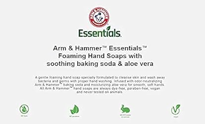 - Un jabón de manos espumante de cítricos naranja perfumado y ligero. Esta fórmula hidratante promueve una buena higiene y hábitos saludables de lavado de manos. La espuma instantánea nutre la piel y deja tus manos limpias y suaves. Un suave jabón de manos espumoso especialmente formulado para limpiar la piel y lavar las bacterias y los gérmenes con el lavado adecuado de manos. Impregnado con un bicarbonato de sodio para hornear Arm & Hammer y aloe vera hidratante para manos suaves y suaves. Los jabones de mano Arm & Hammer siempre son sin tinte, sin parabenos, veganos y nunca probados en animales.