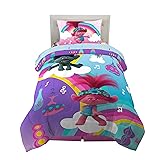 100% Microfiber 4 PIECE TWIN SIZE COMPLETE LINEN SET (Prints May Vary): 1 fitted sheet 39" (W) x 75" (L). 1 flat sheet 66" (W) x 96" (L). 1 standard pillow case 20" x 30".1 twin/full reversible comforter 72" (W) x 86" (L). Designed to fit a standard twin size bed. SUPER SOFT EASY CARE CHILDREN’S BED IN A BAG: Crafted for comfort, the microfiber material is soft keeping kids warm all night. You can throw the set into the washer and dryer without worrying about the pattern fading or the need to for ironing. TWO DESIGNS IN ONE COMFORTER: A reversible comforter lets kids easily switch up the style of their bedroom with Poppy, Branch and Tiny Diamond on one side, and a colorful all-over Trolls World Tour print on the reverse purple side. TROLLS WORLD TOUR DESIGN: DreamWorks brings its cute and cuddly trolls to a bedroom with this colorful bedding set. The bedding features Poppy, Branch, Prince D, Tiny Diamond, King Trollex, Trollzart and Barb from the popular "Trolls World Tour" musical.