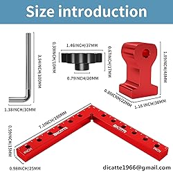 HIGH-QUALITY MATERIALS: Aluminum alloy right-angle clamps are processed by high-quality aluminum blocks, surface anodized treatment, precision workmanship, durable, corrosion-resistant, will not fade, black and red are available. INGENIOUS DESIGN: The right-angle clamp is an L-shaped design. There are two types of scales, namely a 7.1 inch scale and a 180 mm scale. They are located on the front and back sides, making it easier to measure the size. There are 6 holes on the 2 sides of the right-angle clamp, which makes the clamping force stronger. EASY TO USE: Just place the wood to be assembled on a stable table and flatten it, adjust the angle to 90 degrees with a right-angle clamp, and use the clamp to select the appropriate hole to clamp. The advantage of 7.1 inches over 5.5 is that it is not only suitable for small size assembly, but also suitable for various large-scale professional jobs. WIDE RANGE OF USES: This L-shaped right-angle clamp can be used to fix and assemble furniture cabinets, photo frames, cabinets, boxes and other DIY work. Inches and centimeters are indicated separately, which is more user-friendly and convenient for users to work. 100% SATISFACTORY SERVICE: DICATTE supports 6-month free return and exchange service for products. We have opened a 24-hour customer service hotline. If you have any quality problems, please contact the after-sales team as soon as possible.