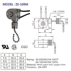 Ceiling Fan Pull Chain Switch: Model ZE-109M. Ideal for lighting fixtures and Fan Lamp Holders. Fan Light Switch Electrical Rating: 6A 125VAC / 3A 250VAC/6A 125VL/3A 125VT. Switch Function: ON-OFF, material is metal up shell, phenolic base. The ceiling fan parts Compatible with Hunter, Hampton Bay, Harbor Breeze, Westinghouse, etc. Certifications: UL approved (USA) - CSA certified (Canada).