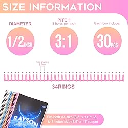 - Success is all about presentation.From sales presentations to educational materials and financial reports. Rayson 34-ring Click Binding is designed for a variety of document finishing systems to help you catch the attention of your audience and student with Colorfulness; Rayson click binding spines offer a variety binding of paper size, binding A4 (8.27"x11.69")size paper and below with Sheet Capacity: 90; Spine Diameter: 1/2"; Number of Rings: 34. Notice 1. If you want to bind the letter size paper 8-1/2x11inches or below size paper, please use the scissor to cut off the over size part. For more help about binding letter size and below, please feel free to contact us. 2. The color show out will be a little different by the screen. 3. Quantity/Unit - 30/Box (Mixed color).