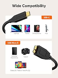 - CableCreation USB Micro B to USB C Cable Cord The Micro USB B to USB C cable connects a computer, PC, Laptop with a USB-C port to a portable USB 3.1 hard drive, SSD, smartphone with Micro-B port for data & charging. Specification Side 1: USB 3.1 Type C Port Side 2: Micro USB 3.0 B Port Data Transmission Speed: 10Gbps Length: 2 FT / 0.6M Compatible Thunderbolt 3 / Thunderbolt 4 / USB4Wide Compatibility USB-C End: * MacBook (Pro), iMac 2017, iMac Pro, MacBook Air * XPS 13, XPS 15 * Chromebook Pixel * Pavilion X2, Yoga 910 * Galaxy S22/ S20/ Note20/ Note10 * Other Host based devices with USB Type C port Micro-B End: * Portable Hard Drive, like Western Digital, Newman, Canvio, Seagate * Smartphone: Galaxy S5, Note 3, Note Pro 12.2, N900 * HD Camera * Other devices that has Micro-B port